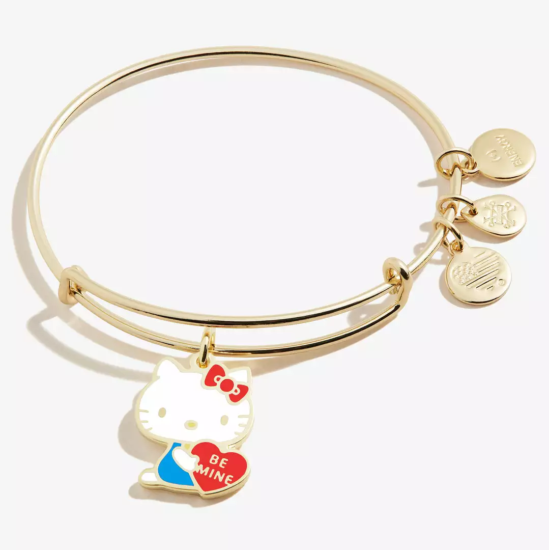 This expandable wire bangle is oh so cute and charming! It features Hello Kitty holding a red heart with a message that says “Be Mine,” along with a few other gold coin charms.