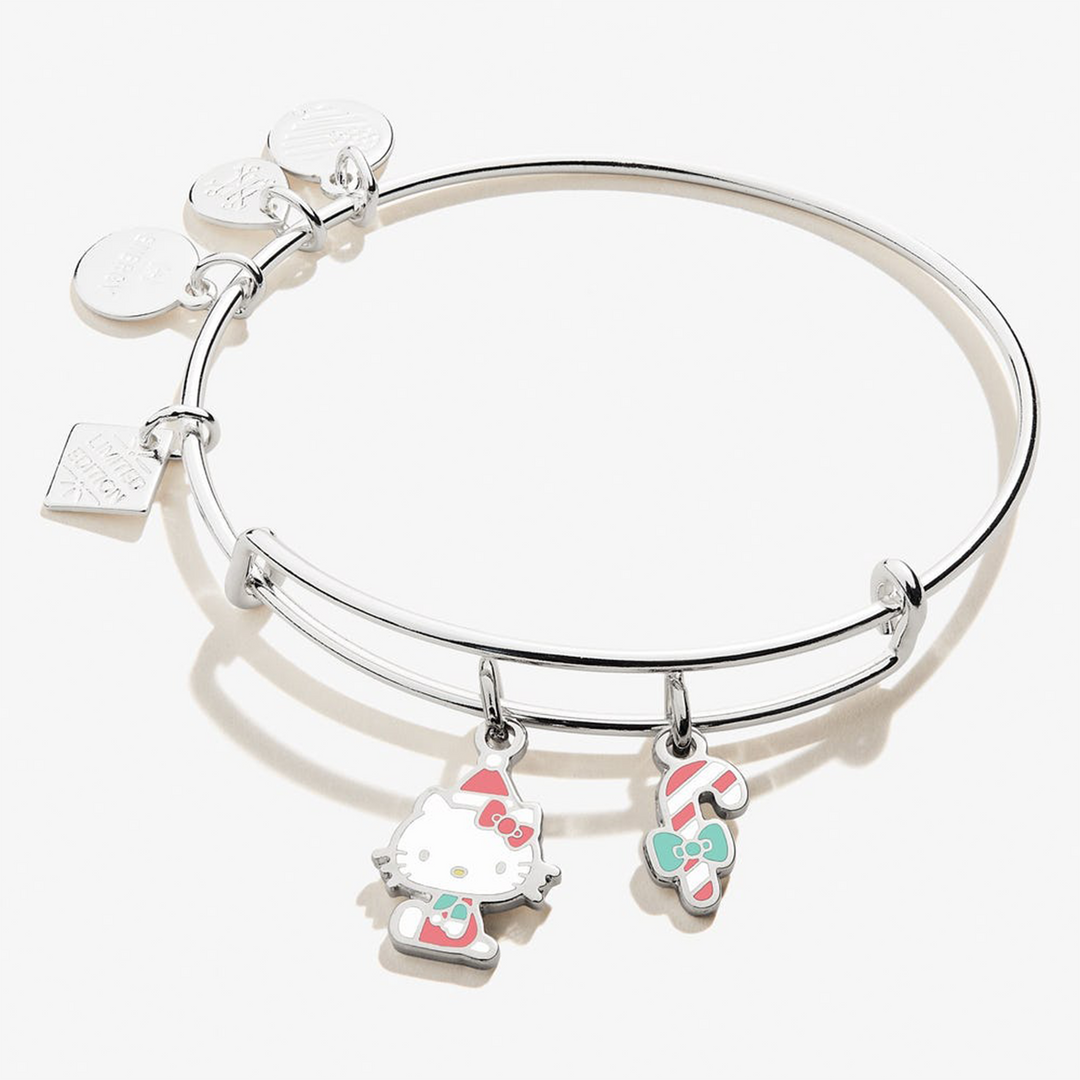 Ring in the season with Hello Kitty in this minimal silver bangle. It includes 2 charms: one features Hello Kitty in a holiday outfit and Santa hat, and the other is a classic red and white candy cane with a green bow. The expandable fit makes it so that it’ll fit any wrist securely!