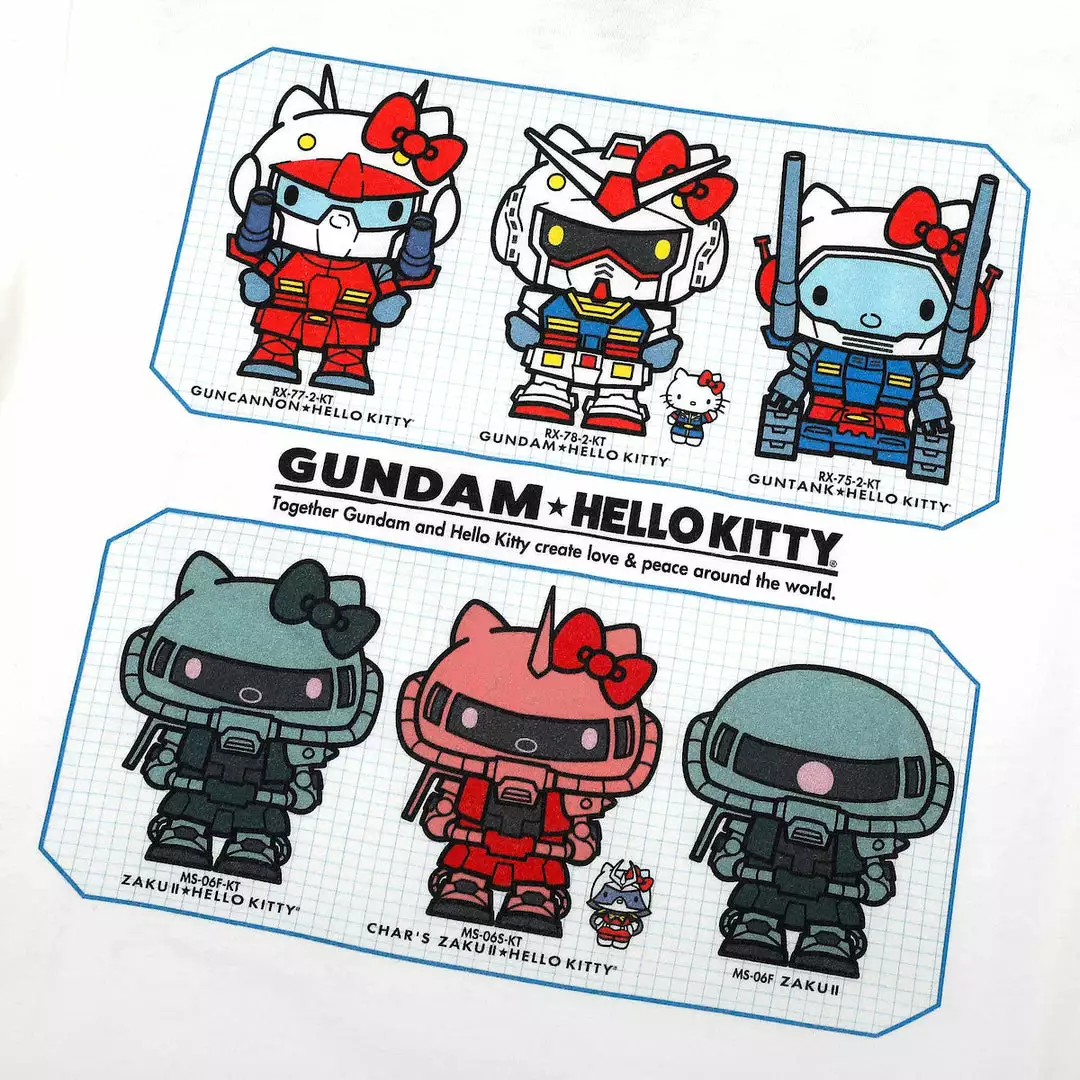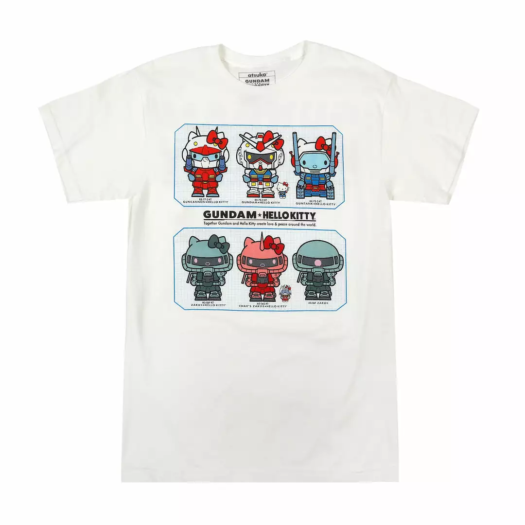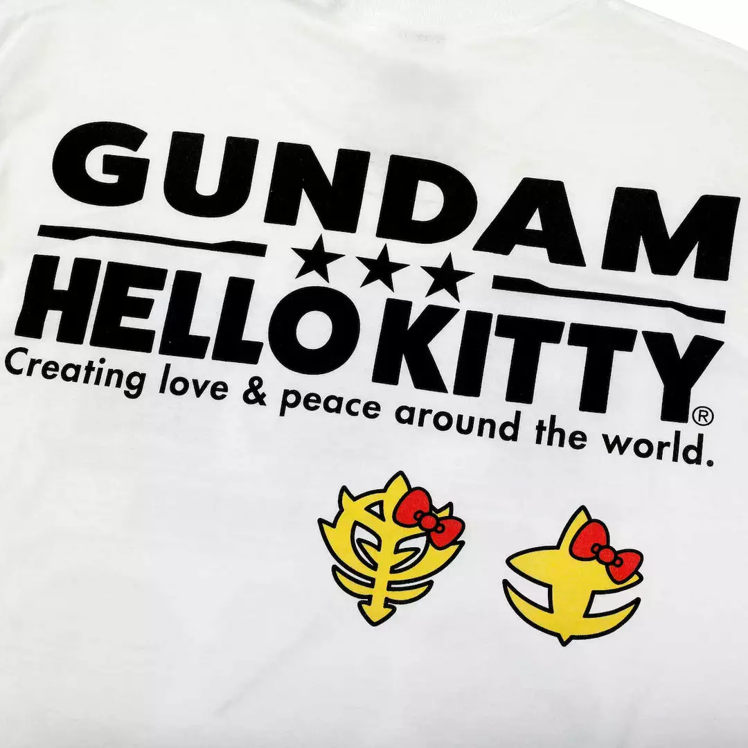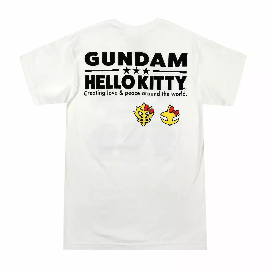 Time to suit up! This tee features a graphic of several mobile suits with a Hello Kitty twist on the front. At the back is a statement logo with the text, “Creating love & peace around the world.