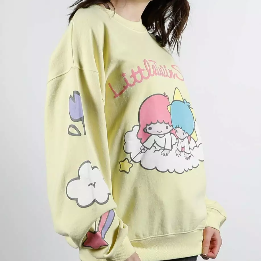 Calling all Kiki and Lala fans! This crewneck sweatshirt is so cute! Not only does it have a main graphic at the front, but also icons along the sleeve and a few more on the back! Wear it oversized for a supercute, street-ready look. ????Â