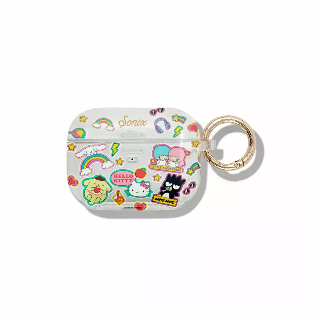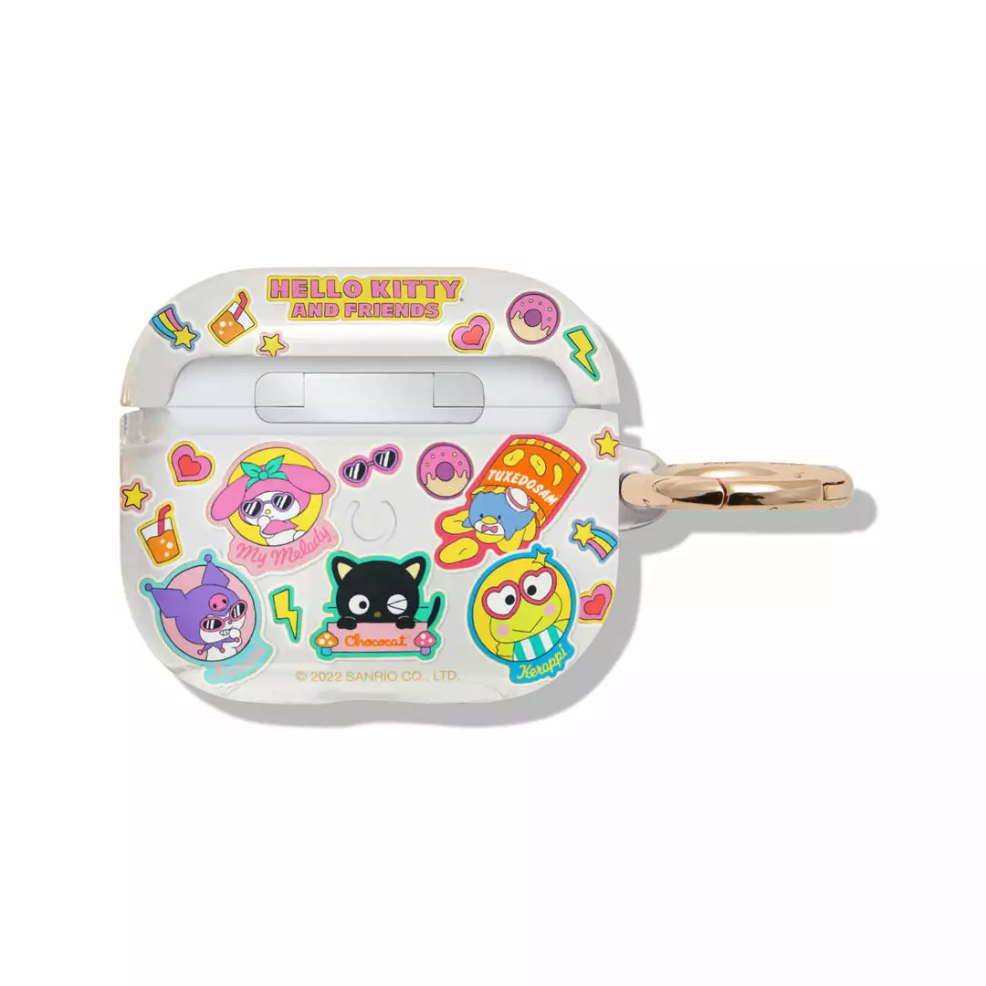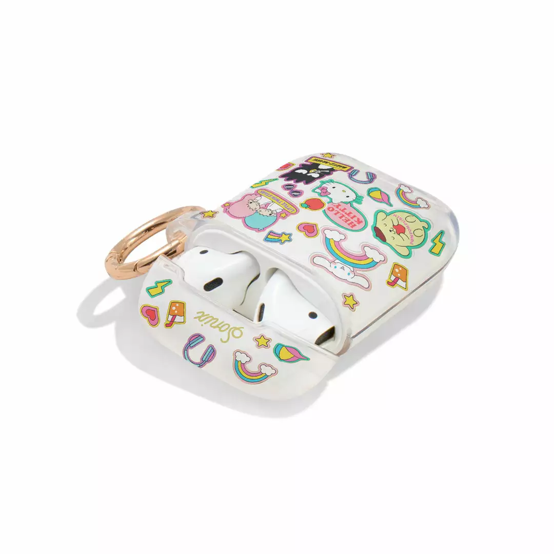 Join the Sanrio squad with a collage of adorable stickers featuring Hello Kitty and Friends! This AirPods case features a playful all-over sticker design with glitter detailing. Use the snap hook to attach your case somewhere securely.