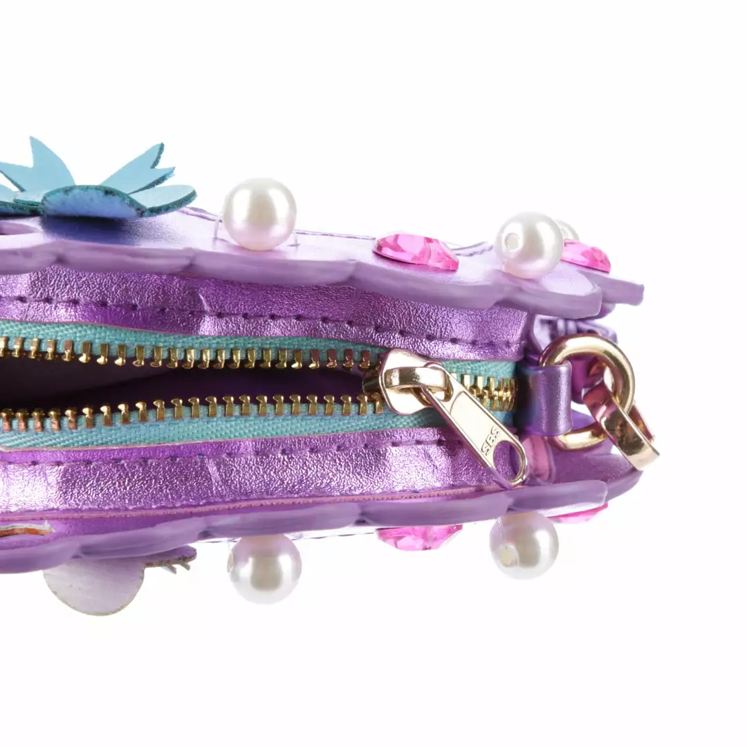 A fun statement bag, this metallic mirror-shaped crossbody is adorned with pearls and bows with a metallic finish. One side features Hello Kitty, and the other has My Melody!