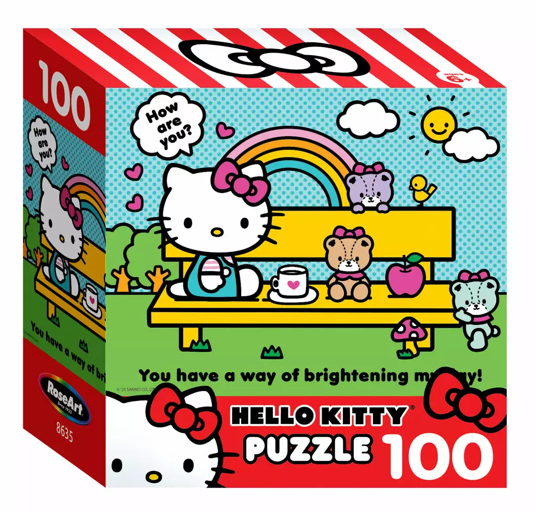 So cute! This 100-piece jigsaw puzzle features Hello Kitty and her friend, Tiny Chum, as well as a few of his siblings, Tiny Lavender and Tiny Green! Full of rich colors and fun details, this puzzle is perfect for a leisurely weekend indoors.