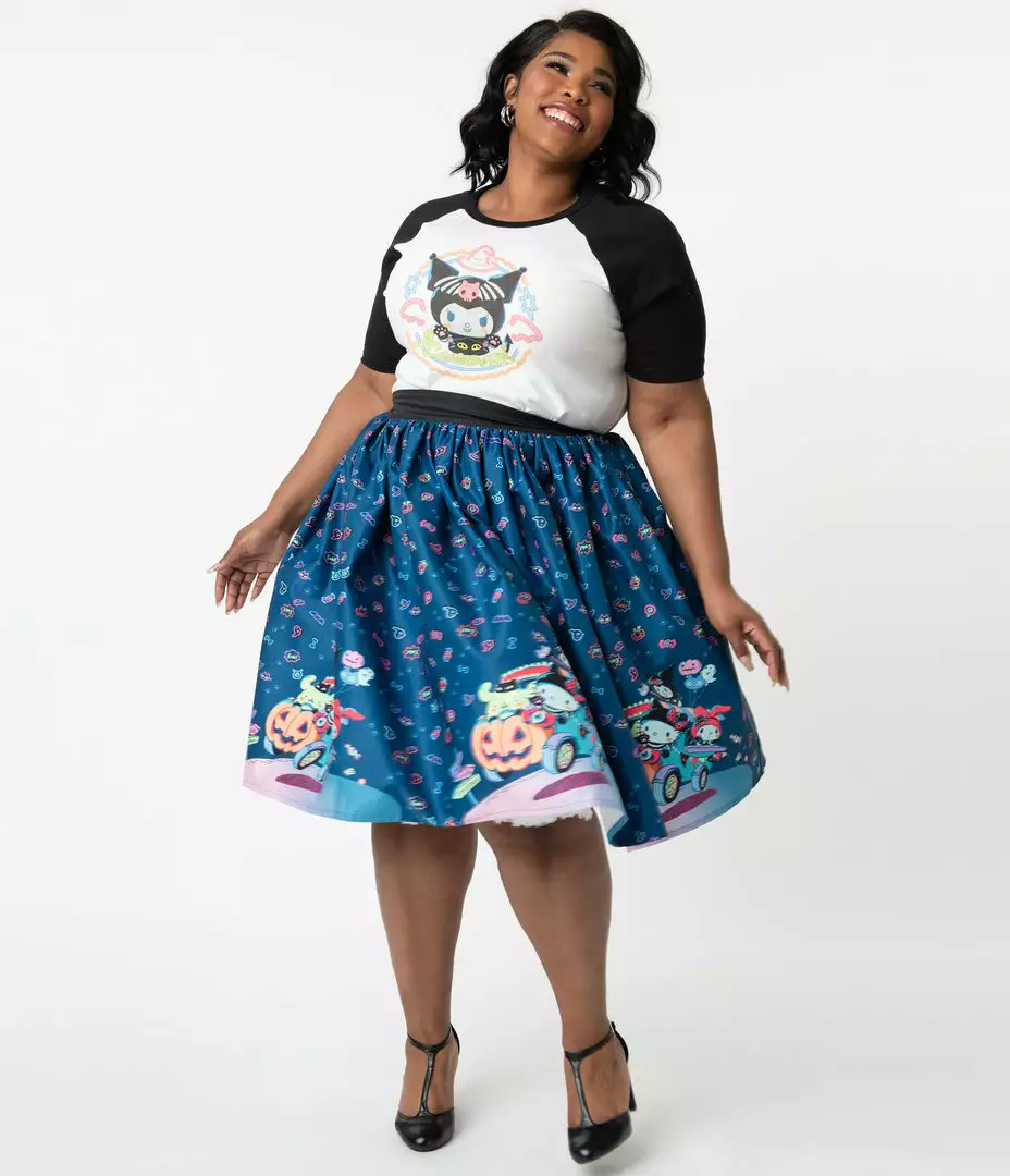 Be like Kuromi and spread havoc wherever you go in this swing skirt from Unique Vintage with Hello Kitty. Designed in a smooth woven blend, this knee-length skirt features Hello Kitty and her friends going on a spooky Halloween joyride! It also has a banded high waist, gathered A-line silhouette, and hidden side pockets to keep all your treats within reach.