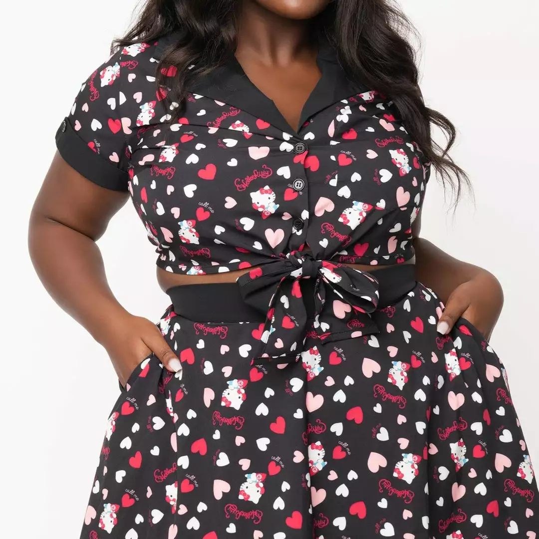 We’re in love! This button-front crop top looks lovely worn both as a separate and with the matching skirt. It has a pattern featuring Hello Kitty on the telephone surrounded by pink and red hearts. Finished with a notched lapel collar and tie-front detail, it’s a total charmer.