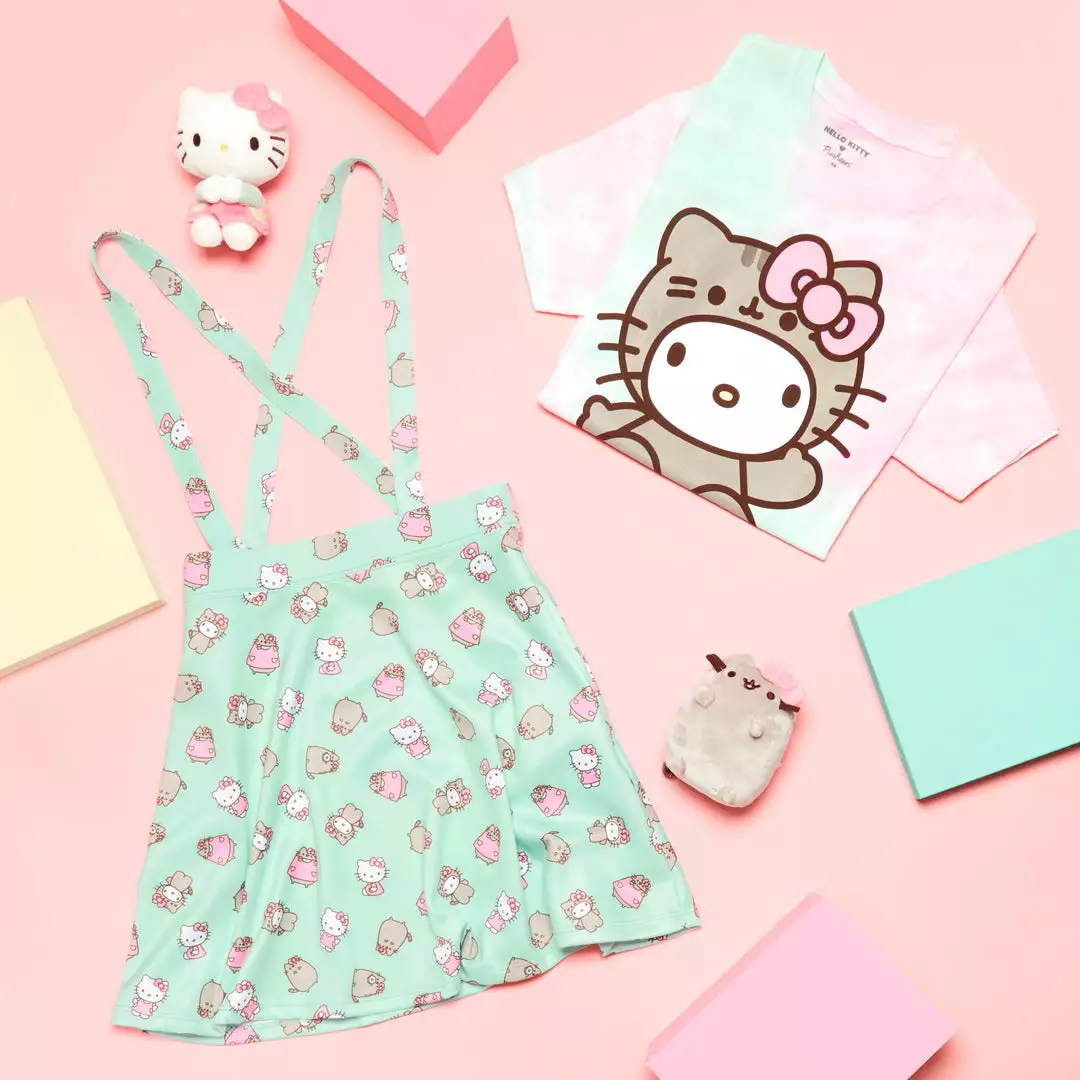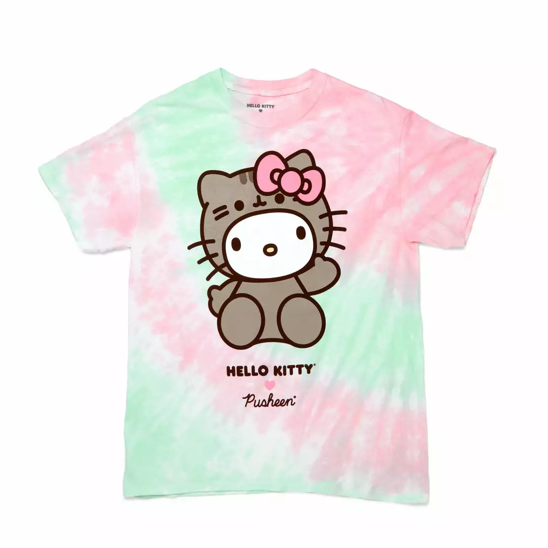 This tee’s tie-dye for. This tee features an off-center pattern of pink and green with the cutest graphic of Hello Kitty wearing a Pusheen costume! With the collab logo printed underneath, it looks as great with your favorite jeans as it does with the Hello Kitty x Pusheen Suspender Skirt.