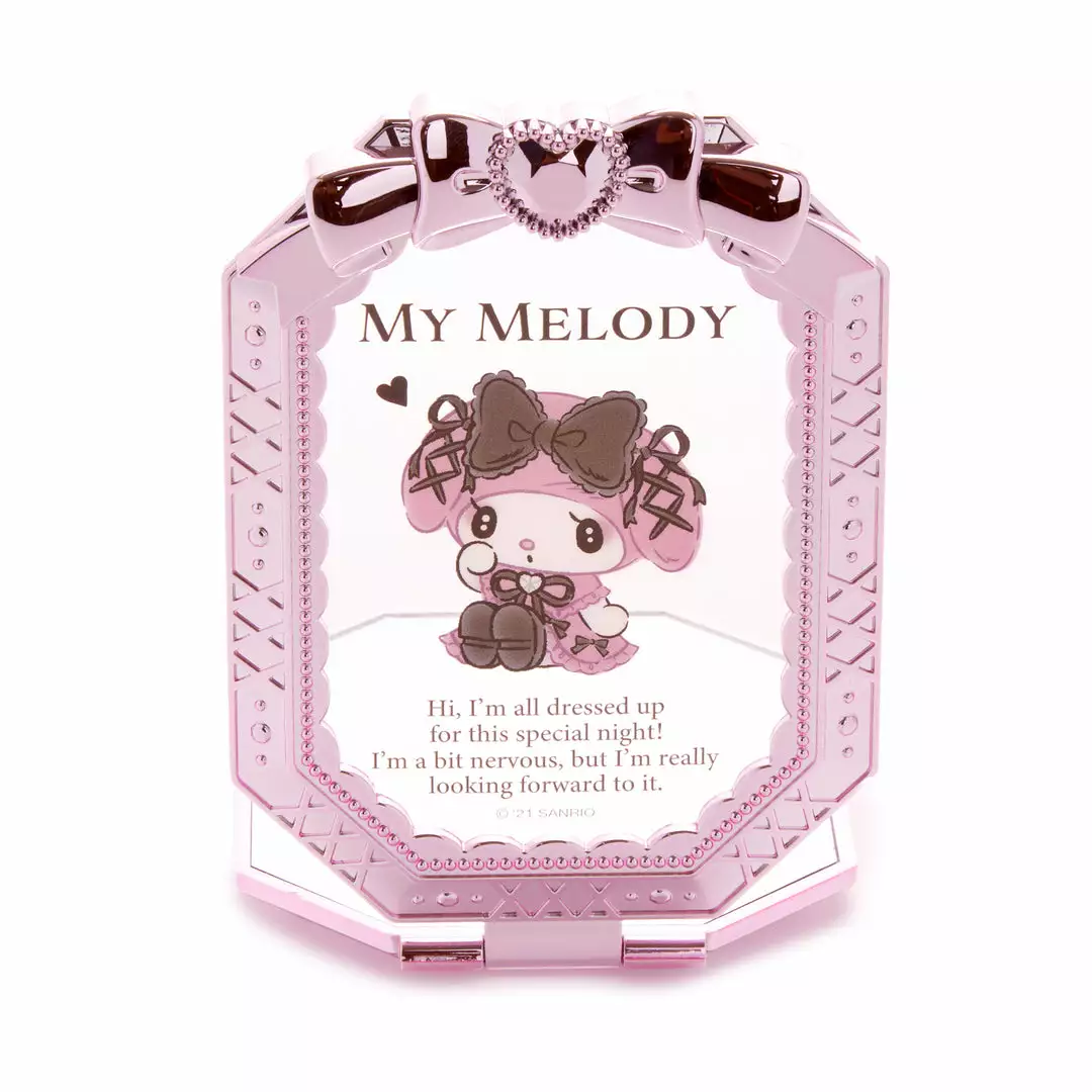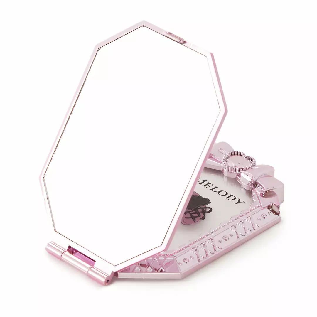 With a chrome-like rosy pink finish, this folding compact mirror is perfect for die-hard My Melody fans. Moody and romantic, it features a clear cover with My Melody artwork and an embossed heart with wings on the back with the words, “A special friend, a special night.”