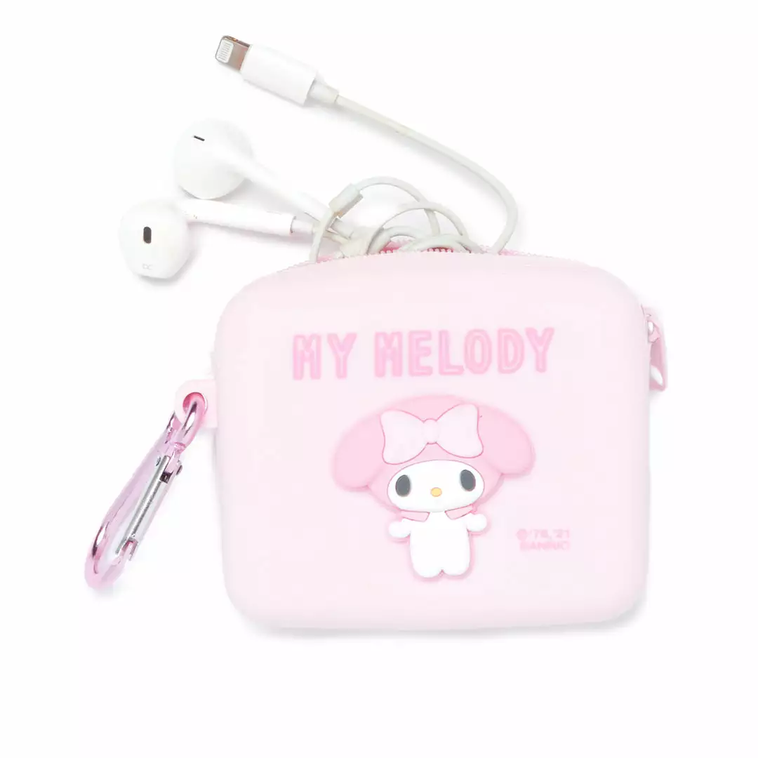 Keep your loose bills, earphones, and more in this handy silicone pouch. It features a die-cut My Melody applique at the front with a heart-shaped carabiner for easy carrying.