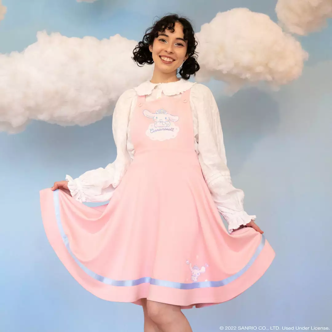 A special JapanLA x Cinnamoroll 20th Anniversary Capsule Collection Piece by My Violet! This dress features a pink pinafore dress with a cute print of Cinnamoroll on a cloud on the front. The skirt has a blue statin ribbon and print of Cinnamoroll with some yummy sweets. The pinafore dress straps have adjustable length buttons. My Violet is a dreamy LA-based boutique dedicated to all things pastel.