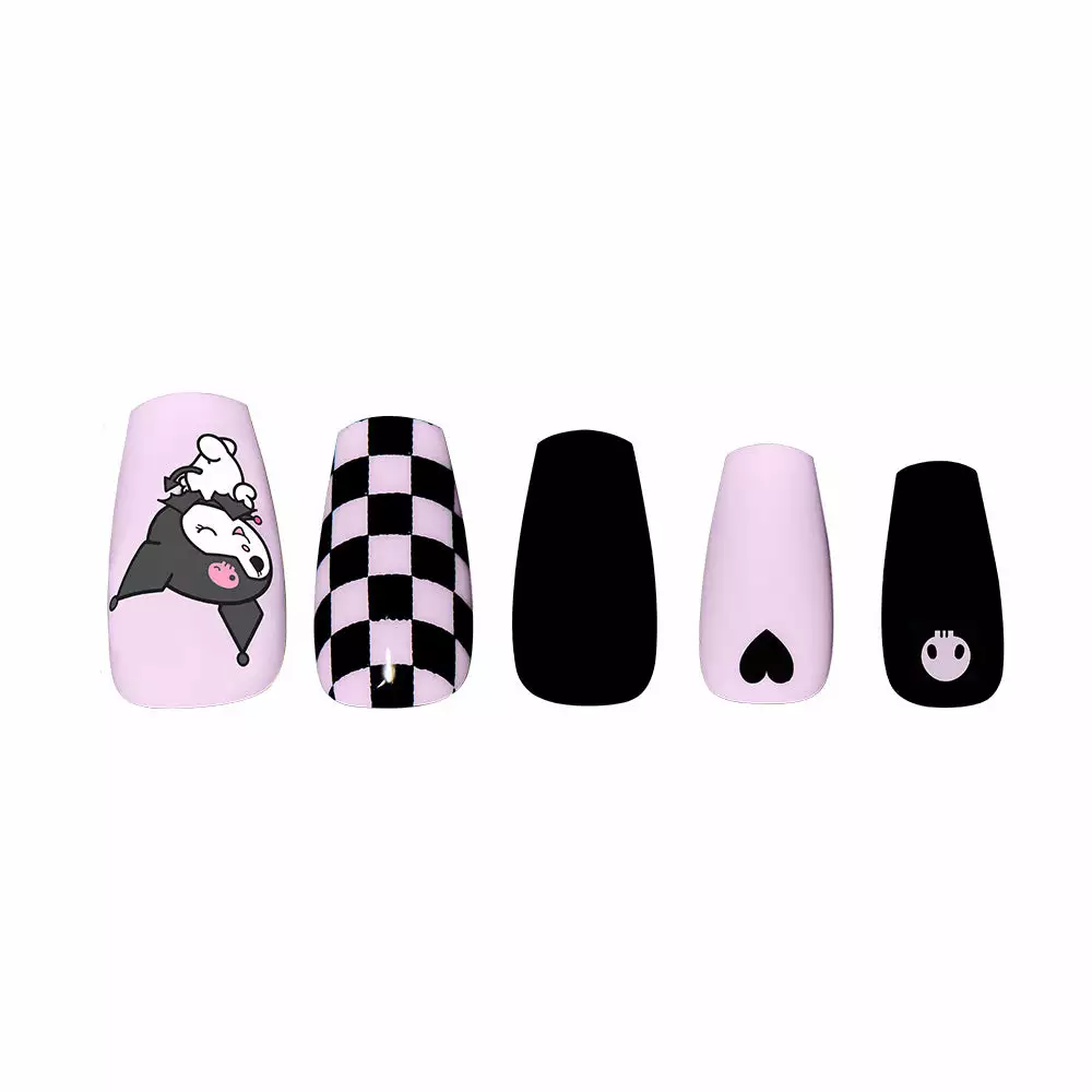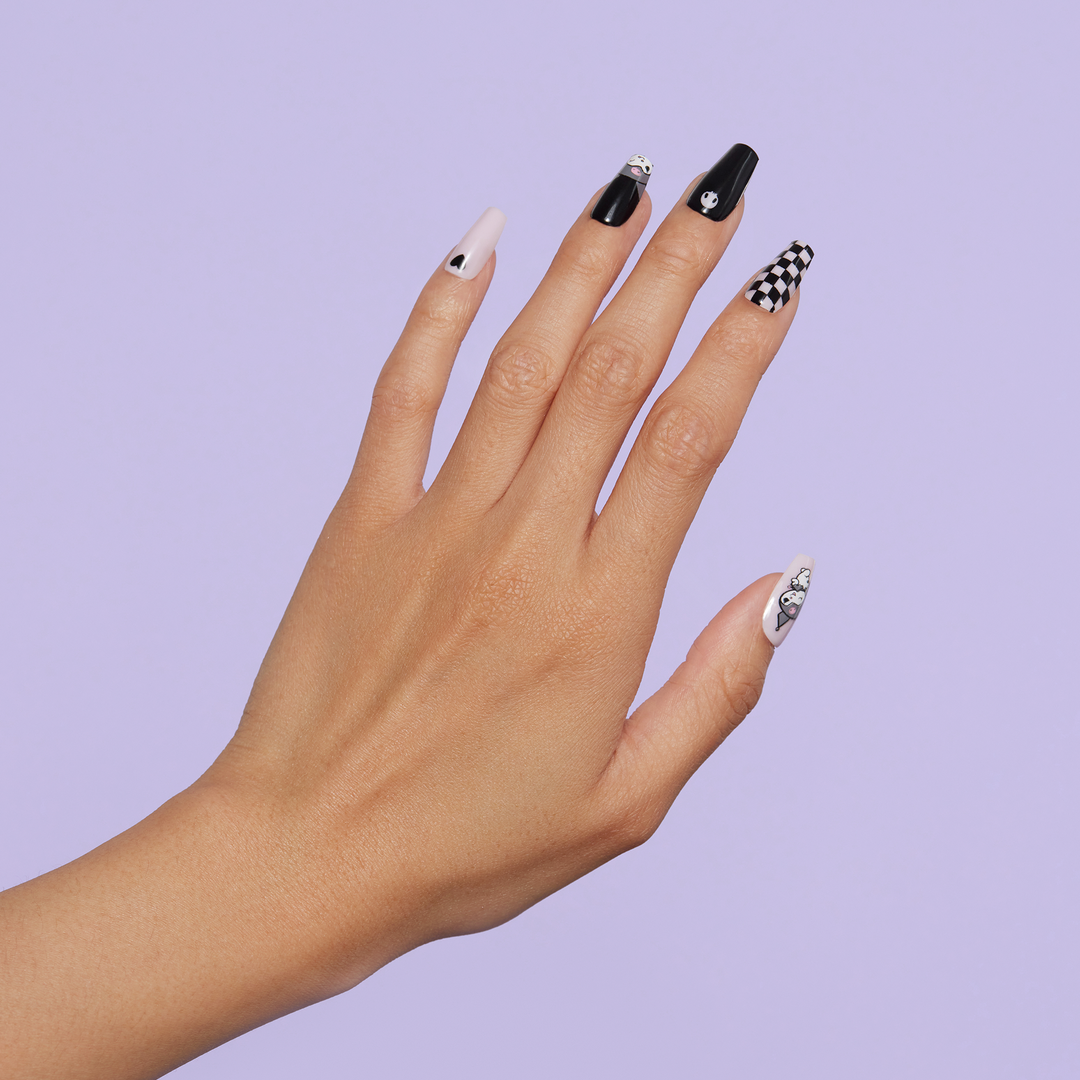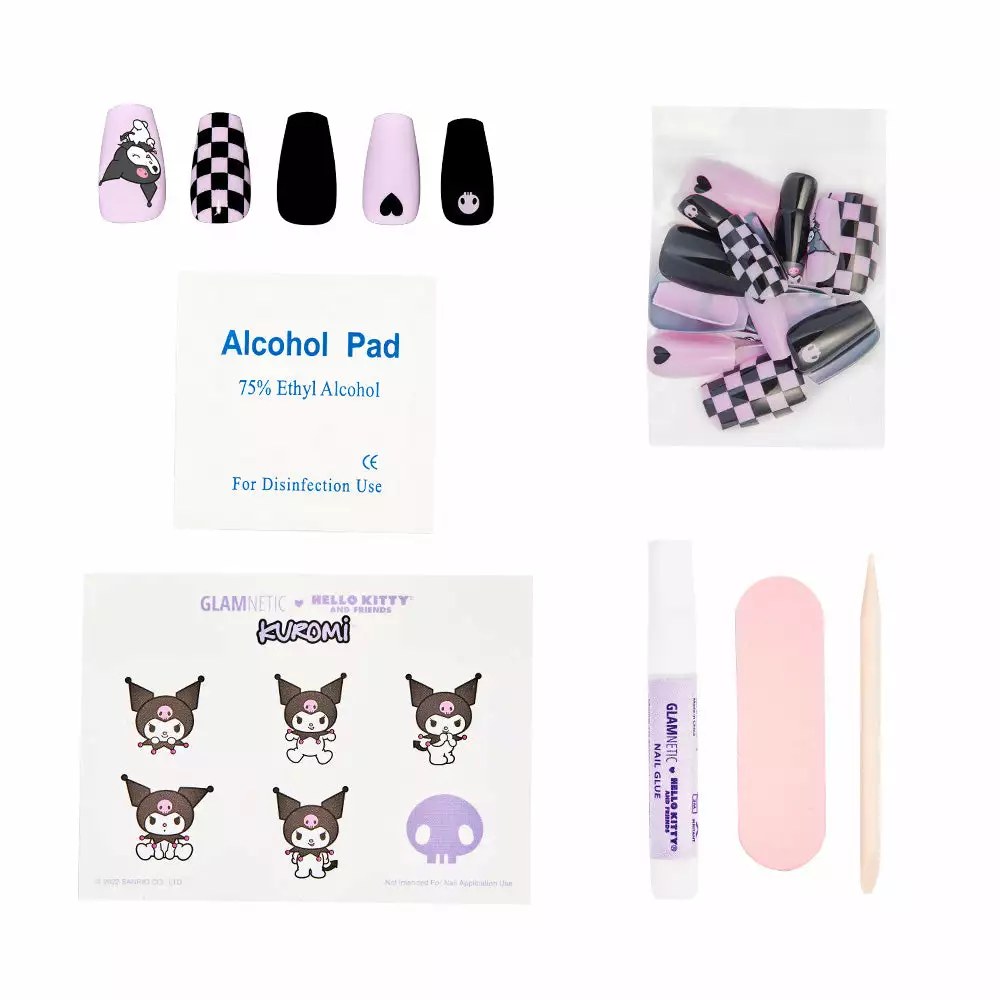 Head on your next jet-set adventure with these exclusive Hello Kitty & Friends press-on nails! This Kuromi Press-On Nail Kit comes in a short coffin shape and features Kuromi’s signature edgy design with various nails in black, white, and gingham for a mischievous energy!Â
