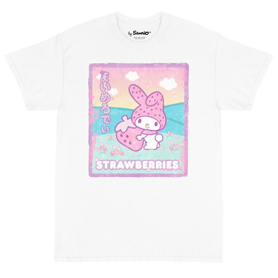 Name a cuter drink than strawberry milk! We’ll wait! That soft, creamy pink color is too cute to resist. We ended up creating a small collection of graphic tees that’s just as sweet. This tee features My Melody giving a strawberry a loving hug! The Japanese text spells out, “My Melody” in hiragana.