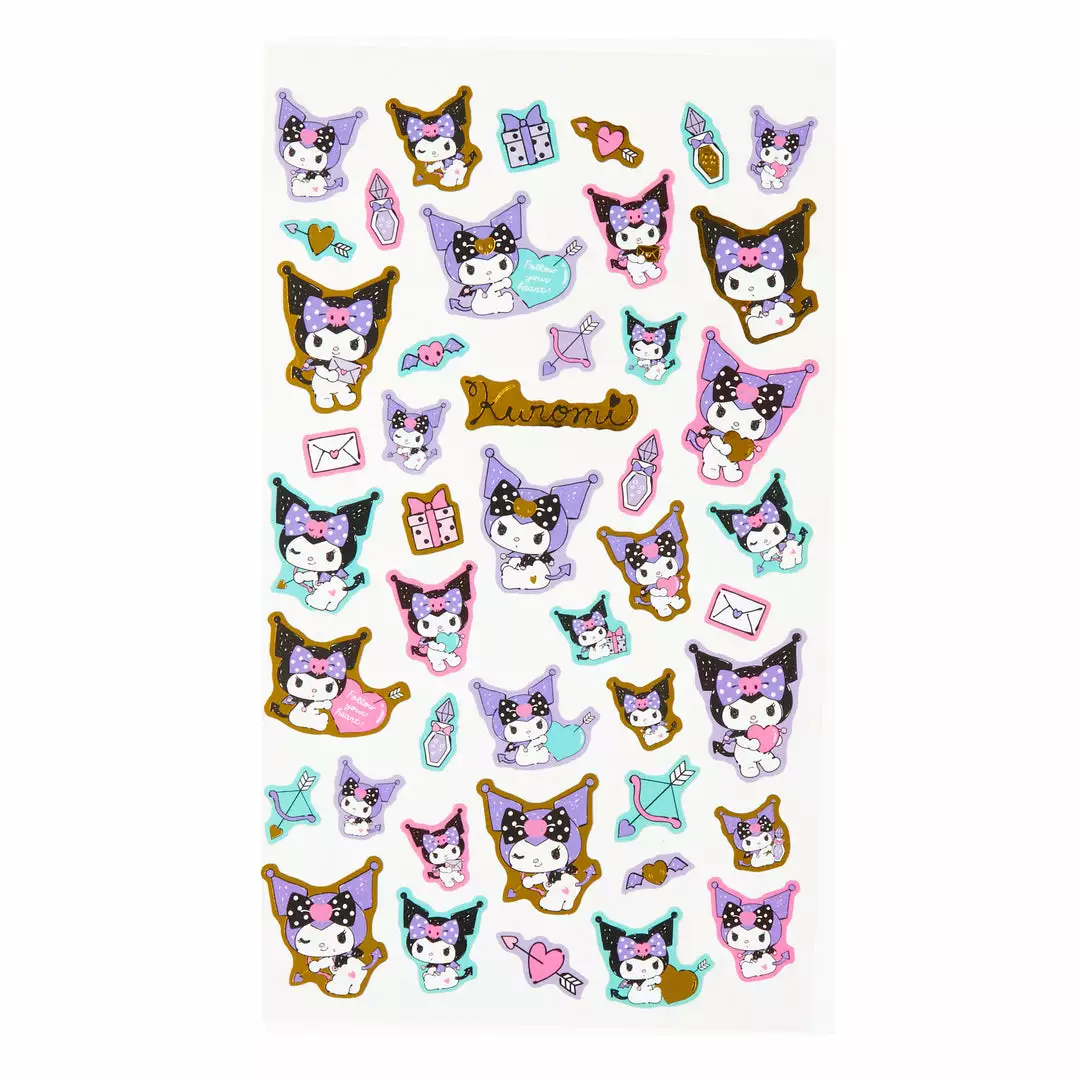 Rep your favorite Sanrio characters with these sticker sheets! Each has a select handful of individual stickers outlined in metallic gold for a luxe and glitzy finish. This sheet features Kuromi wearing a big, polka-dotted black bow!