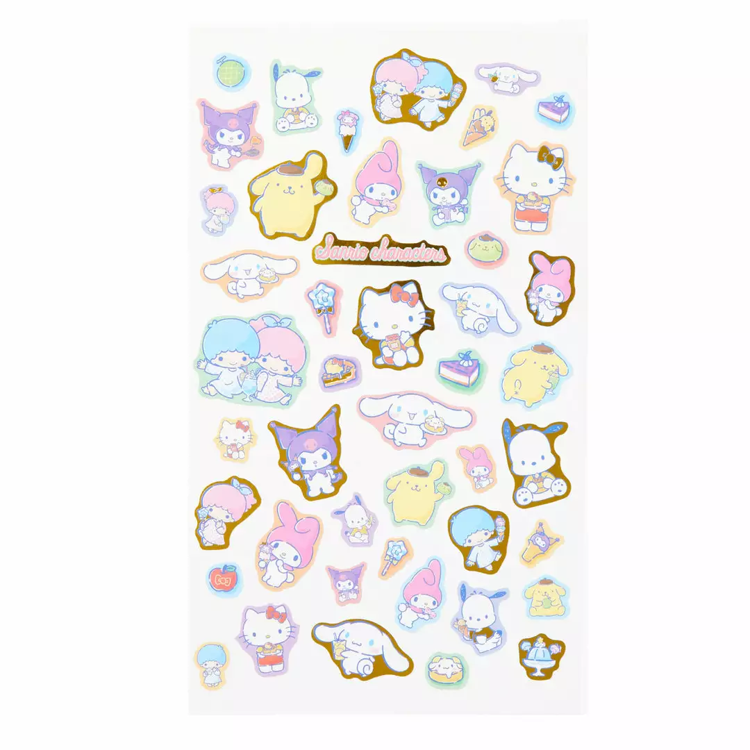 Rep your favorite Sanrio characters with these sticker sheets! Each has a select handful of individual stickers outlined in metallic gold for a luxe and glitzy finish. This sheet features Hello Kitty and Friends in a colorful art style with sweet treats.