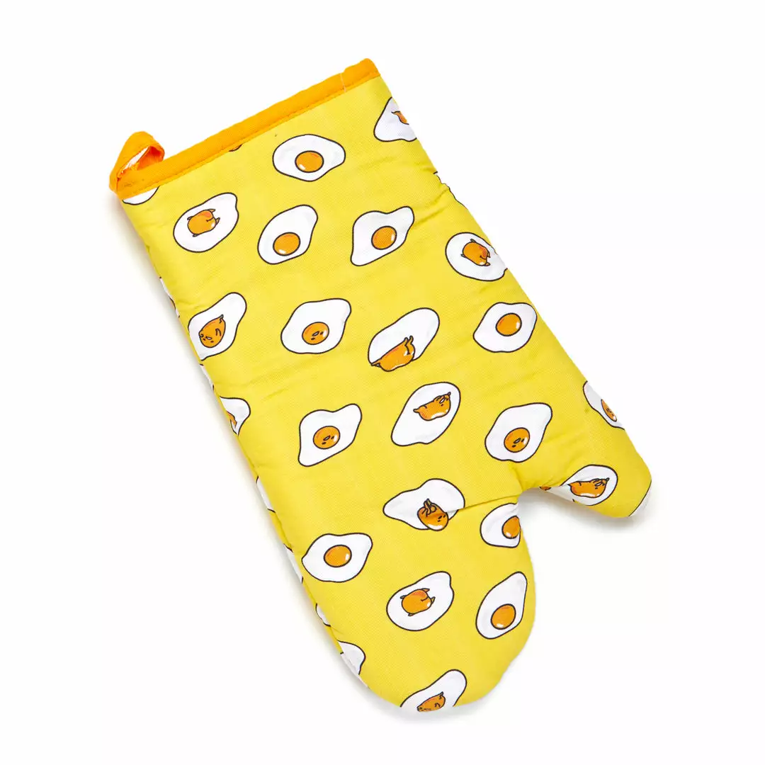Whether you’re making a quiche or frying eggs on the stove, keep your hands safe from hot temperatures with this fun oven mitt! It has a Gudetama print all-over and is finished with a hanging loop and yolky-yellow trim.